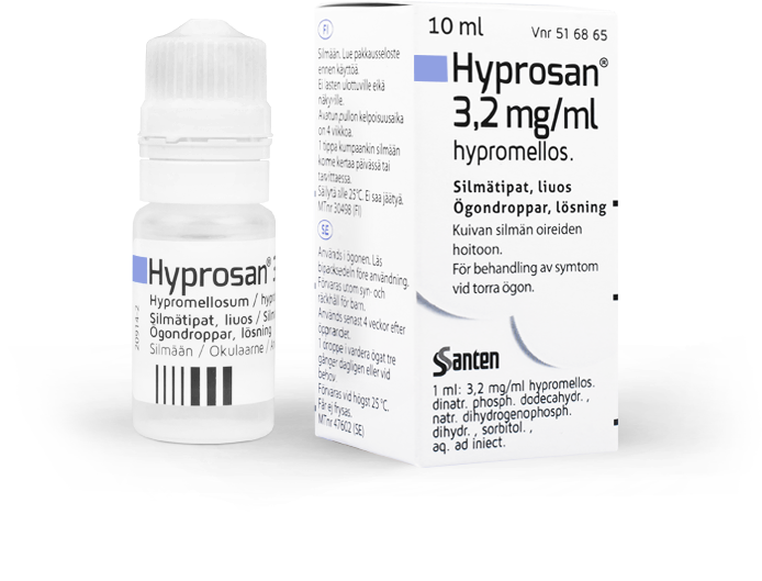 Hyprosan (hüpromelloos) 3,2 mg/ml silmatilgad. Toimeaine: hüpromelloos. Näidustus: loomuliku pisaravedeliku asendamine täiskasvanutel kuiva silma sündroomi, kaasa arvatud kuiva keratokonjunktiviidi korral. Annused ja manustamisviis: üks tilk kummasegi silma kolm korda päevas või vastavalt vajadusele. Lapsed: Hyprosani (hüpromelloos) ohutus ja efektiivsus lastel ja noorukitel vanuses kuni 18 aastat ei ole tõestatud. Manustamisviis: vältimaks väljauhtumise võimalust, peaks Hyprosani (hüpromelloos) manustama alati vähemalt viis minutit pärast mõne teise silmaravimi silma panemist. Vastunäidustused: ülitundlikkus toimeaine või abiainete suhtes. Hoiatused ja ettevaatusabinõud: Hyprosan (hüpromelloos) ei sisalda ühtegi säilitusainet, seega tohib seda kasutada kontaktläätsede kandmise ajal. Koostoimed teiste ravimitega ja muud koostoimed: koostoimeid ei ole uuritud. Rasedus: hüpromelloosi süsteemne toime on ebaoluline, toimet raseduse kulule ei ole oodata. Hyprosani (hüpromelloos) võib kasutada raseduse ajal. Imetamine: kuna hüpromelloosi süsteemne toime imetaval naisel on ebaoluline, siis toimet rinnaga toidetavale vastsündinule/imikule ei ole oodata. Hyprosani (hüpromelloos) võib kasutada imetamise ajal. Fertiilsus: kõrvalmõjusid viljakusele pole täheldatud, kuna hüpromelloosi süsteemne toime on ebaoluline. Toime reaktsioonikiirusele: Hyprosani (hüpromelloos) on kerge toime autojuhtimise ja masinate käsitsemise võimele, kuna võib pärast manustamist põhjustada ajutist nägemise hägusust. Kõrvaltoimed: Täheldatud on järgnevaid kõrvaltoimeid hüpromelloosi lahuse kasutamisel: lokaalne kipitustunne, valu silmas või hägune nägemine. Pakend: 10 ml. Saadaval apteegis ilma retseptita. Tutvuge pakendis oleva infolehega. Sümptomite jätkudes ja diagnoosi saamiseks pöörduge arsti poole.